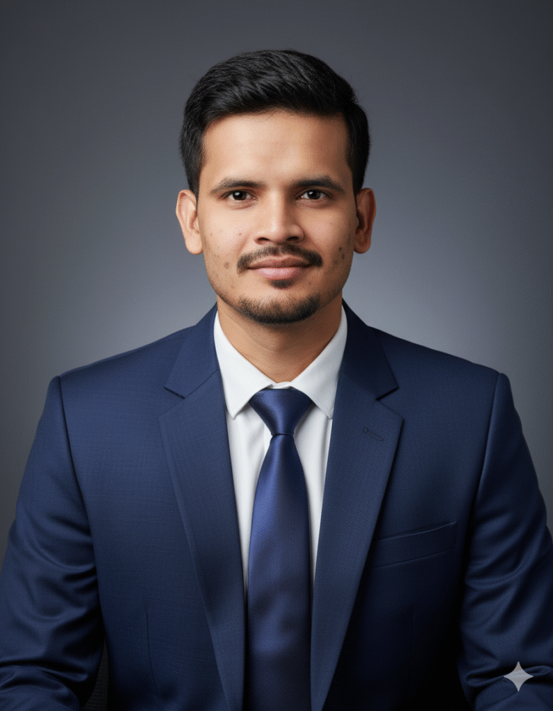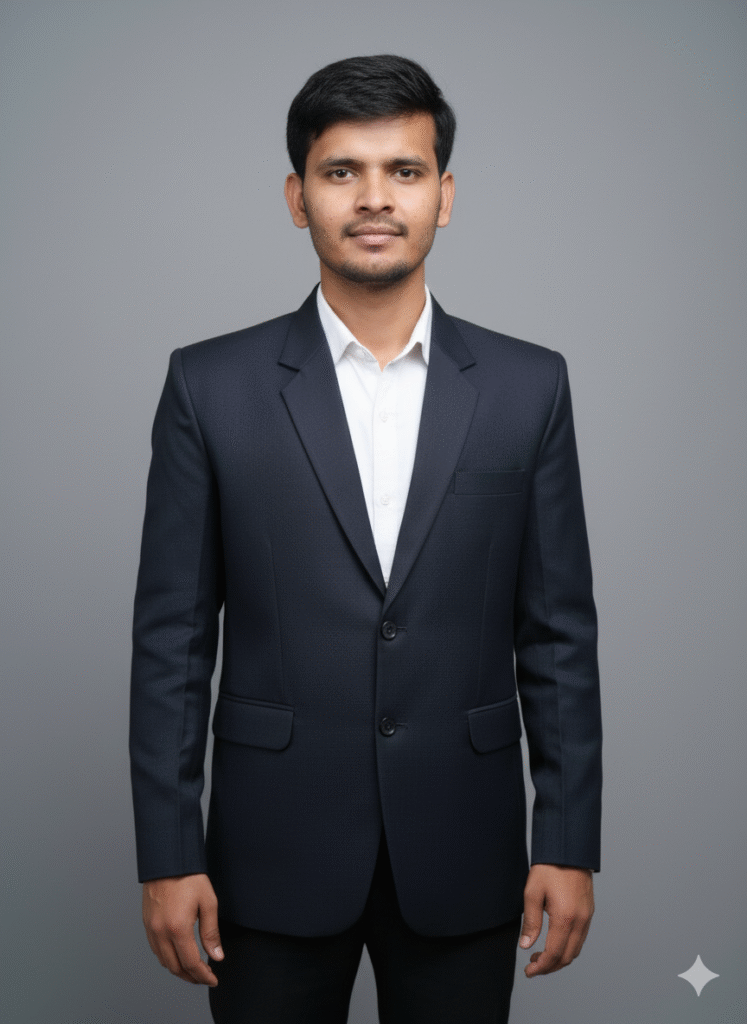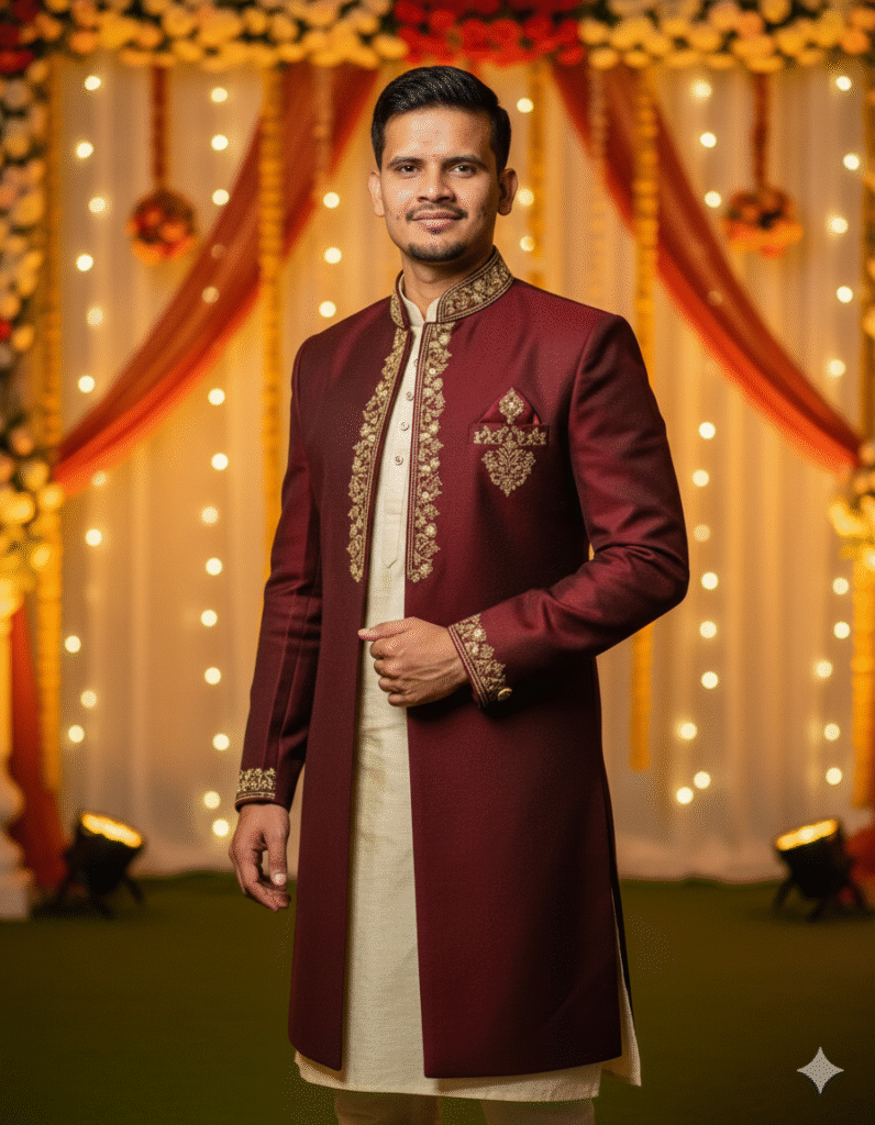 Prompt: Generate a male portrait wearing traditional Indian attire, such as kurta and sherwani, with subtle embroidery. Include warm lighting, festive background elements, and a composed smiling expression in 4K HD.