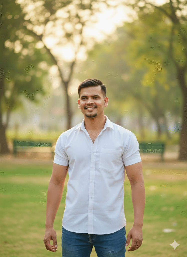 Prompt: Generate a casual outdoor portrait of a man wearing a crisp white shirt and denim jeans, standing in a sunlit park. Include soft sunlight, green foliage in the background, and a natural smiling expression. Capture a relaxed, everyday vibe in 4K HD.