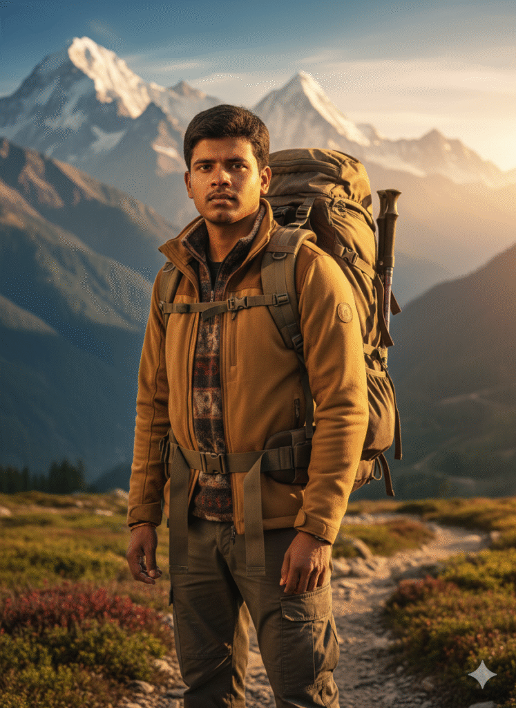 Prompt: Generate a male portrait in an adventurous travel setting, wearing rugged outdoor gear and a backpack. Include mountain scenery, golden-hour sunlight, and a determined expression. Capture dynamic textures and vibrant colors in 4K HD.