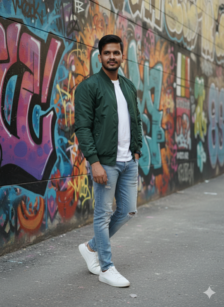 Prompt: Generate a trendy male portrait with street style fashion, including a bomber jacket, sneakers, and urban graffiti background. Include natural daylight, casual pose, and confident expression in 4K HD.