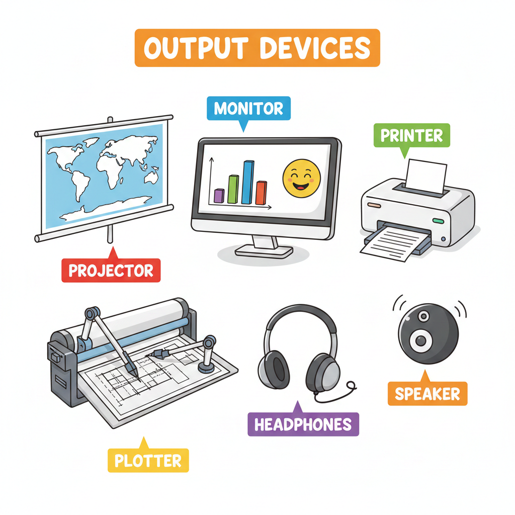 - Printer โ Produces hard copies on paper (Inkjet, Laser, Dot Matrix).