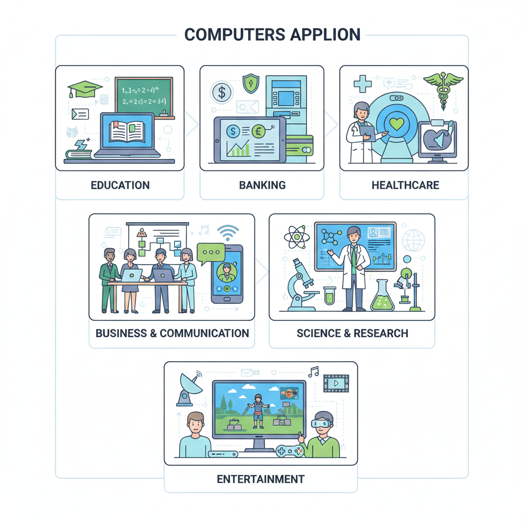 Computers are widely used in almost every field of modern life. They help humans perform tasks faster, more accurately, and efficiently. Below are the major applications of computers explained in detail.