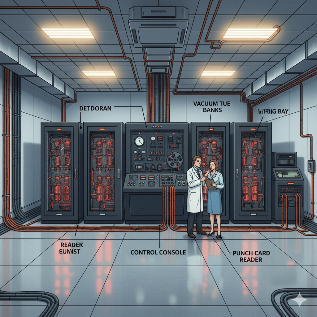 | First | 1946–1959 | Vacuum Tube | Machine language, batch processing, huge, slow, expensive, generated heat | ENIAC, EDVAC, UNIVAC, IBM-701 |